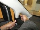 1. Poista suojamuovi ProClip-kiinnikkeen kaksipuoleisilta liimaliuskoilta. Paina kiinnikkeen kulmikas alaosa A-pilarin ja kuminauhan väliseen rakoon ja kiinnitä se A-pilarin taakse.