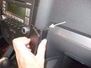 2. Paina kiinnikettä stereoa vasten, niin että kulmikas vasen osa menee stereon ja sitä ympäröivän paneelirungon väliin. Paina, kunnes kuulet / tunnet sen napsahtavan. HUOMAUTUS: kulman reunan tulee mennä stereoraon väliin (katso nuolet kuvassa).