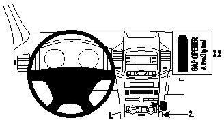 Puhdista alue, johon ProClip-kiinnike asennetaan, mukana toimitetulla märkäpyyhkeellä. Paina ohjauspaneelin ja sitä ympäröivän kehyksen väliin suljettua raon avaajaa, jotta rako laajenee. Poista suojamuovi ProClip-kiinnikkeen kaksipuoleisilta liimanauhoilta.