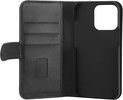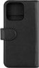 Nahkajäljitelmästä valmistettu matkapuhelinkotelo, jossa iPhone 13 Pro on kiinnitetty lompakkoon sisäänrakennetulla irrotettavalla muovisuojuksella. Kuori kiinnitetään paikalleen sisäänrakennetun magneetin avulla.