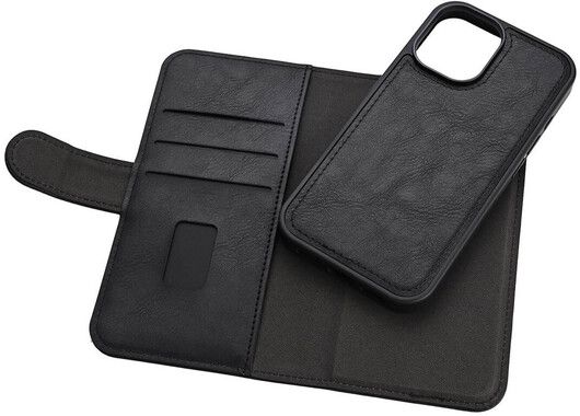 Keinonahkainen matkapuhelinkotelo, jossa iPhone 16 on kiinnitetty lompakkoon integroidussa irrotettavassa muovikuoressa. Kuori kiinnitetään paikoilleen sisäänrakennetulla magneetilla.