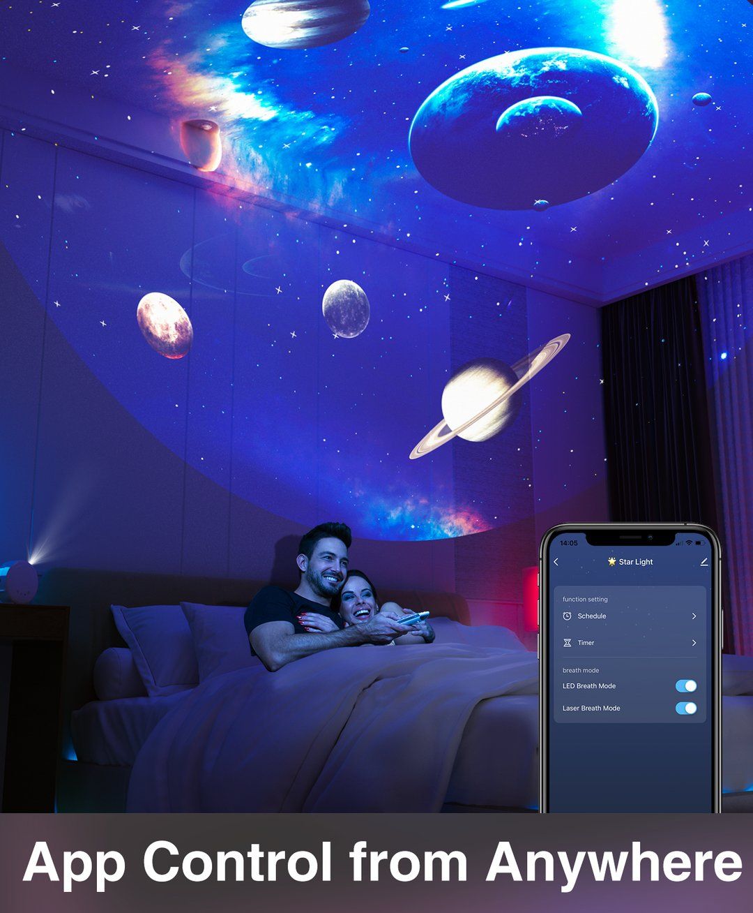 Luo erityinen tunnelma kotiisi. Projektorin ja siihen liittyvien elokuvien avulla voit projisoida erilaisia tehosteita, esimerkiksi tähtitaivaan. Lisäksi näytettävä projektio kääntyy 360° entistä parempien visuaalisten tehosteiden saavuttamiseksi.