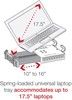 Tämä No-Drill kannettavan tietokoneen jalustajärjestelmä asennetaan nopeasti ja helposti määritettyihin ajoneuvoihin käyttämällä olemassa olevia laitteita matkustajan puolen istuimen kiskoissa. Tämä kokoonpano tarjoaa teleskooppiominaisuuden, joka vaihtelee 12-18 tuumaa. Kaksoiskääntövarret tarjoavat niveltymisen ja 12 tuuman ulottuvuuden matkustajien ja kuljettajan pääsylle asennettuun yksikköön. aten kumipallo ja -kanta tarjoavat lisäsäätöä sekä iskun- ja tärinäeristyksen. RAM Tough-Tray on jousikuormitettu 10" - 16" leveille kannettaville tietokoneille (17" leveät näytöt). Lokerossa on neljä säädettävää kiinnitysvartta, joissa on kumikahvat. Näitä varsia voidaan siirtää sekä pysty- että vaakasuunnassa. Tämä mahdollistaa mukautettu sopivuus eripaksuisiin kannettaviin tietokoneisiin ja vapaus olla estämättä portteja tai laitteita. Näyttöteline ja USB-valo ovat myös saatavilla lokeron lisävarusteita varten. Lokeron kehällä olevat reikäkuviot helpottavat lisämuistijärjestelmien asentamista GPS- tai muuta elektroniikkaa.