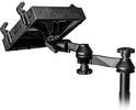 Tämä No-Drill kannettavan tietokoneen jalustajärjestelmä asennetaan nopeasti ja helposti määritettyihin ajoneuvoihin käyttämällä olemassa olevia laitteita matkustajan puolen istuimen kiskoissa. Tämä kokoonpano tarjoaa teleskooppiominaisuuden, joka vaihtelee 12-18 tuumaa. Kaksoiskääntövarret tarjoavat niveltymisen ja 12 tuuman ulottuvuuden matkustajien ja kuljettajan pääsylle asennettuun yksikköön. aten kumipallo ja -kanta tarjoavat lisäsäätöä sekä iskun- ja tärinäeristyksen. RAM Tough-Tray on jousikuormitettu 10" - 16" leveille kannettaville tietokoneille (17" leveät näytöt). Lokerossa on neljä säädettävää kiinnitysvartta, joissa on kumikahvat. Näitä varsia voidaan siirtää sekä pysty- että vaakasuunnassa. Tämä mahdollistaa mukautettu sopivuus eripaksuisiin kannettaviin tietokoneisiin ja vapaus olla estämättä portteja tai laitteita. Näyttöteline ja USB-valo ovat myös saatavilla lokeron lisävarusteita varten. Lokeron kehällä olevat reikäkuviot helpottavat lisämuistijärjestelmien asentamista GPS- tai muuta elektroniikkaa.