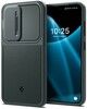 Spigen Optik Armor on kova kuori, jossa on integroitu kamerasuoja. Voit vetää kameran suojuksen linssien päälle, kun et käytä Samsung Galaxy S24 -puhelinta lisäsuojan ja yksityisyyden takaamiseksi.