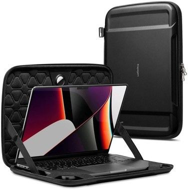 Suojus, jossa on sisäänrakennetut kuminauhat, jotka pitävät tietokoneen paikallaan. Hienoa myös pitää tietokone kotelossa työskennellessäsi.