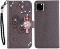 Lompakkolaukku, jossa kaksi korttipaikkaa ja setelitasku. Kotelossa on pöllöt ja kimaltelevia kiviä.