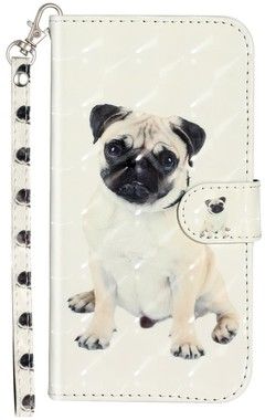 Valkoinen lompakkokotelo, jossa on söpö koira. Kotelossa on kolme korttipaikkaa ja setelitasku.