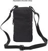 Pehmeä laukku, jossa on useita vetoketjulla suljettavia lokeroita. Laukussa on tilaa matkapuhelimelle ja muille tavaroille.